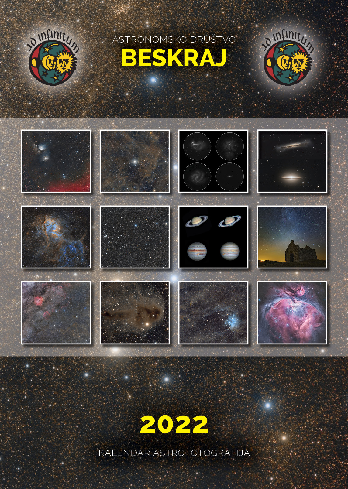 Tradicionalni kalendar astrofotografija člaanova AD Beskraj će uskoro izaći iz tiska! Možete ga naručiti do isteka zaliha, a preuzimanje ili slanje će početi nakon 22.12.2021. Na kalendaru su upisane faze Mjeseca i mnogi zanimljivi astronomski događaji. Fotografije na kraju godine možete izrezati i ukrasiti vaš dom ili radno mjesto. Uz fotografije, tu su i odlične skice Vedrana Vrhovca koje pokazuju neke popularne objekte kako se vide golim okom kroz teleskop.