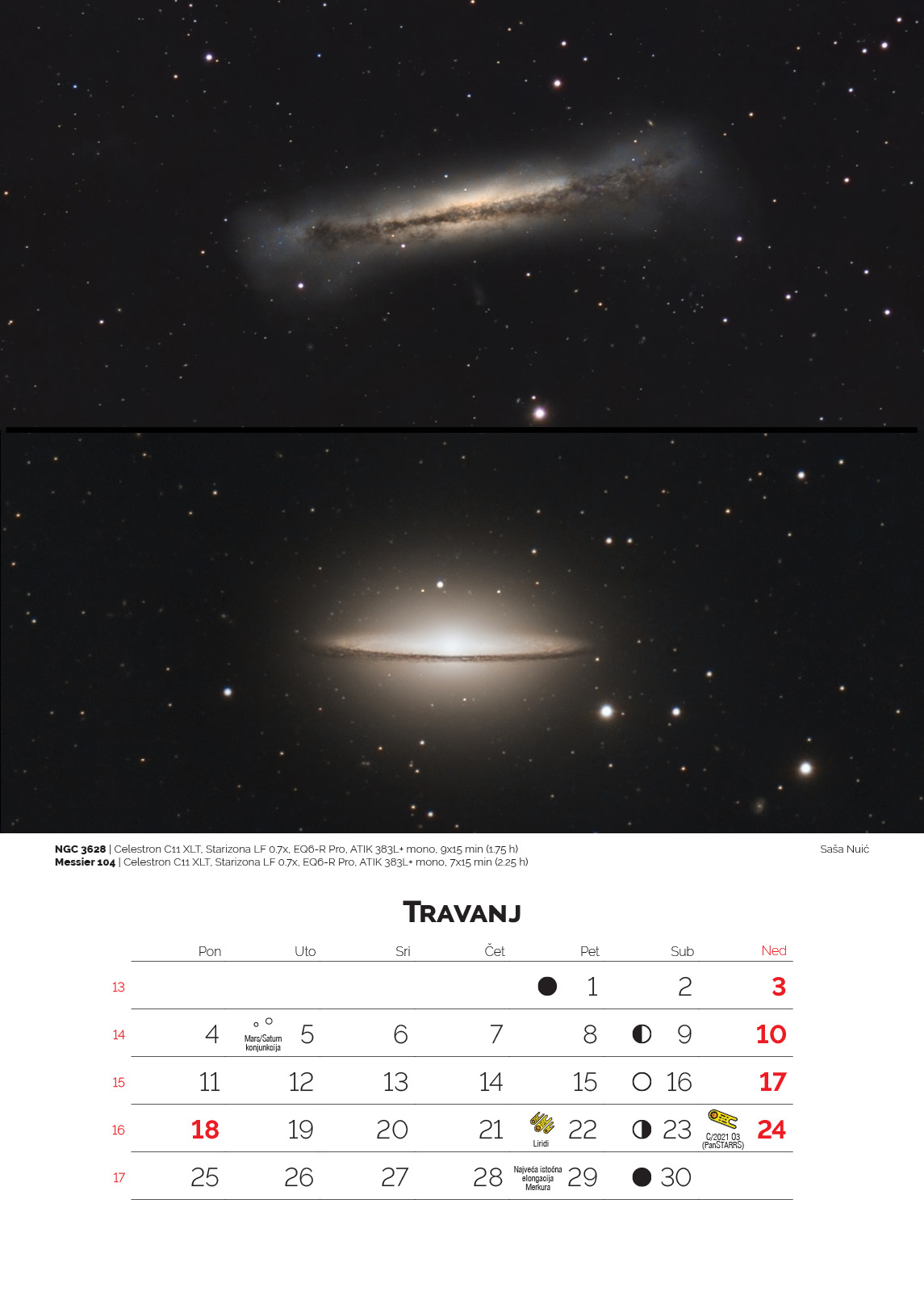 Dimenzija kalendara je A3, a otisnuti su na kvalitetnim 135-gramskom premaznom papiru, uvezeni spiralom, s kukicom za objesiti na zid. U samom kalendaru smo osim stadardnih faza Mjeseca nastojali postaviti informacije o zanimljivom astronomskim događanjima tijekom godine.