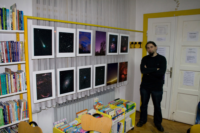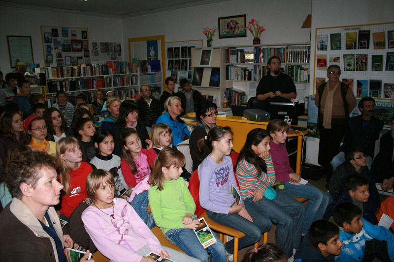 Zadnja etapa naše putujuće izložbe astrofotografija bila je u Hrvatskoj Kostajnici. Mislili smo posjetiti i Petrinju, ali su nam u tamošnjoj knjižnici nimalo uljudno rekli da smo “zakasnili” – čudno za grad u kojem se rodio naš poznati popularizator astronomije, Oton Kučera. No, u Kostajnici nas je dočekala prepuna knjižnica, a djeca su bila iznimno zainteresirana za predavanje! Izložba je već bila postavljena i to na vrlo lukav način – na fotografiji izgleda kao da slike “lebde”, a zapravo su postavljene na prozirni flaks! Bravo za Kostajničance 🙂