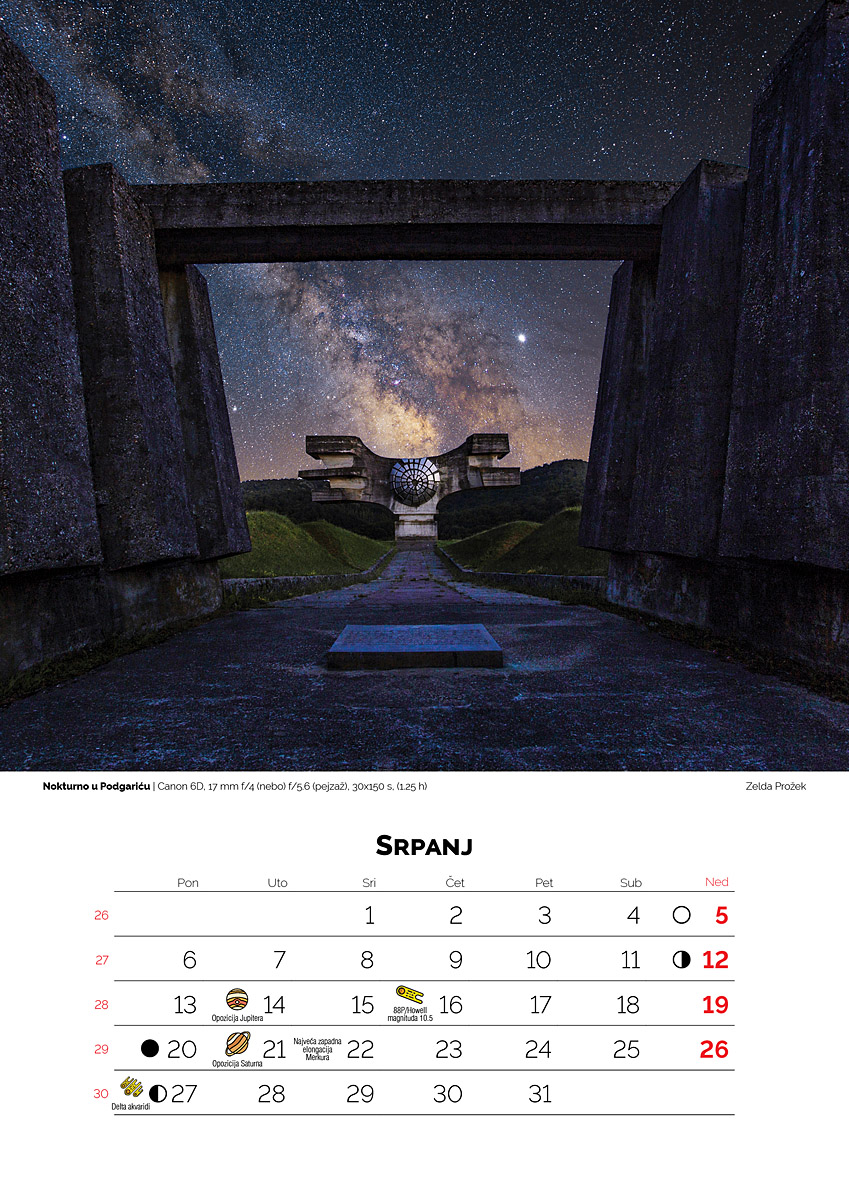 Nastavljamo s tradicijom godišnjeg kalendara s astrofotografijama članova udruge. Kalendar sadrži 11 fotografija članova udruge s opisima korištene opreme, te jednom serijom skica objekata kako se vide prostim okom kroz teleskop koje je napravio naš Vedran Vrhovac. Fotografije su napravljenen najrazličitijom opremom, od fotoaparata postavljenih na stativ, pa do velikih teleskopa s velikom žarišnom duljinom za pogled na udaljene galaksije.
